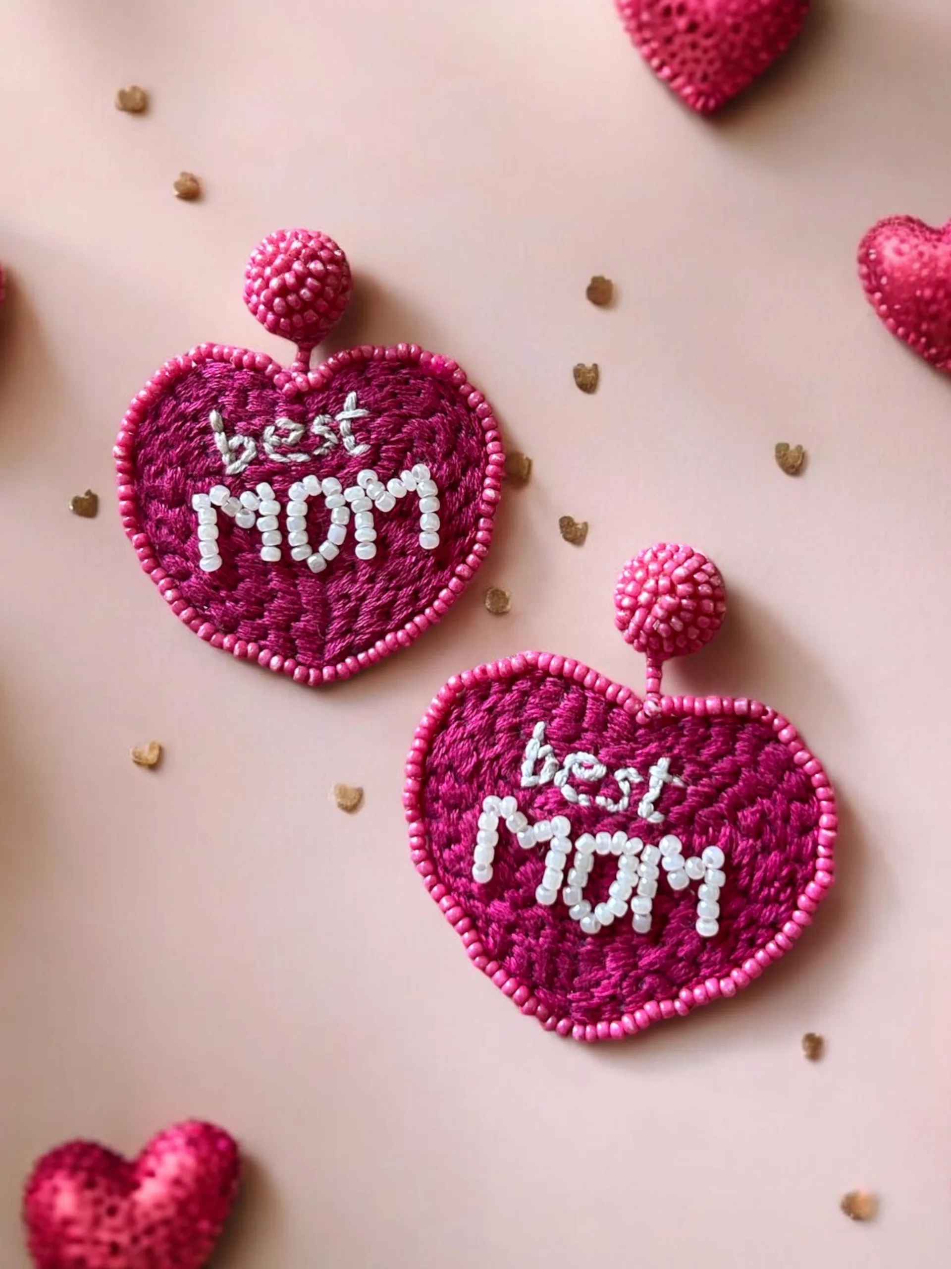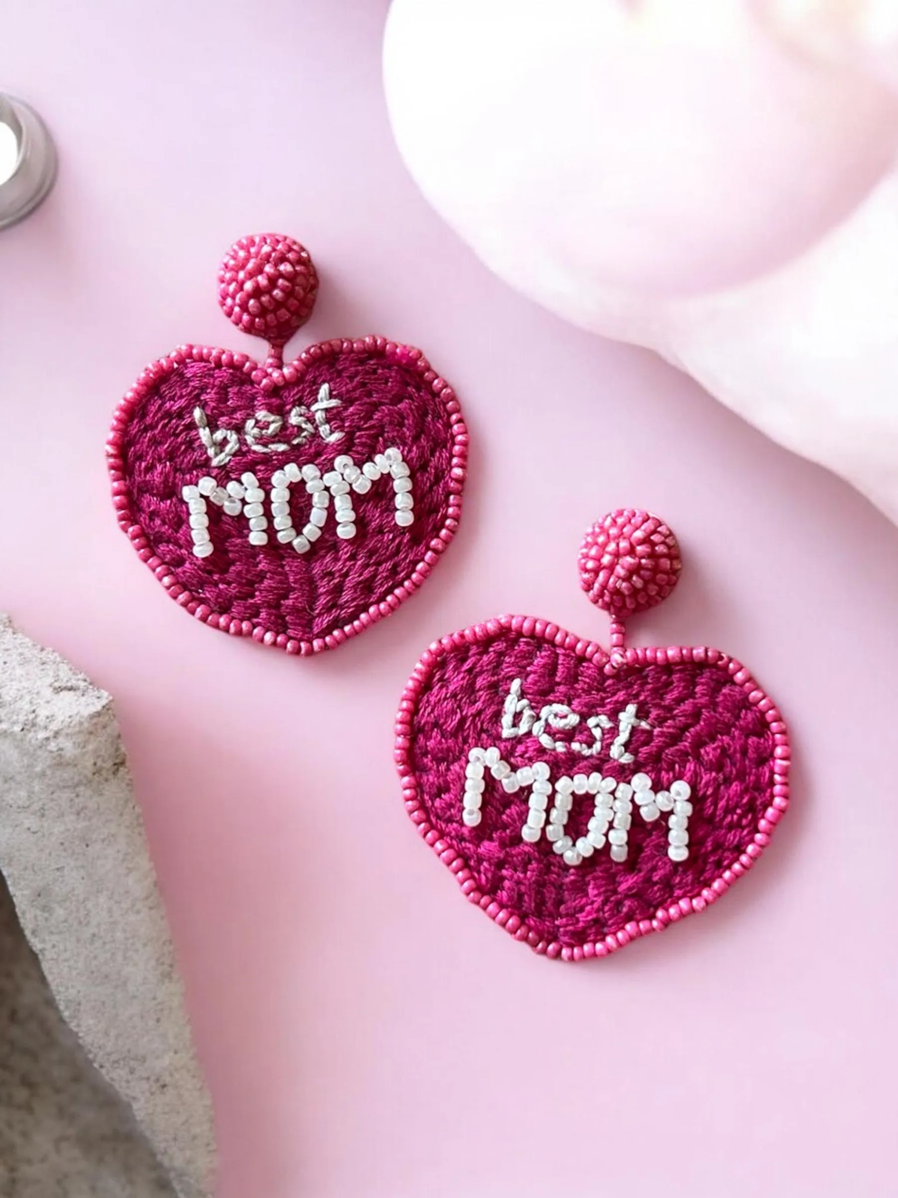 Handcrafted heart-shaped statement earrings featuring detailed hand embroidery with “Best Mom” lettering, finished with delicate bead outlining. Cute, meaningful, and full of personality, these earrings are the perfect blend of love, emotion, and handcrafted charm.