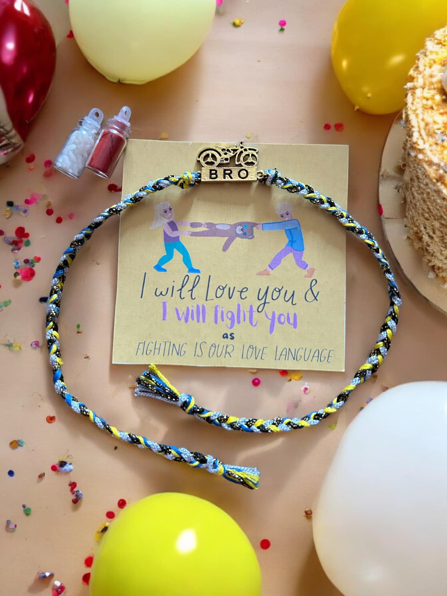 This rakhi hamper includes “Biker Bro” handmade rakhi with a small card and roli-chawal. Suitable for both kids and adults.