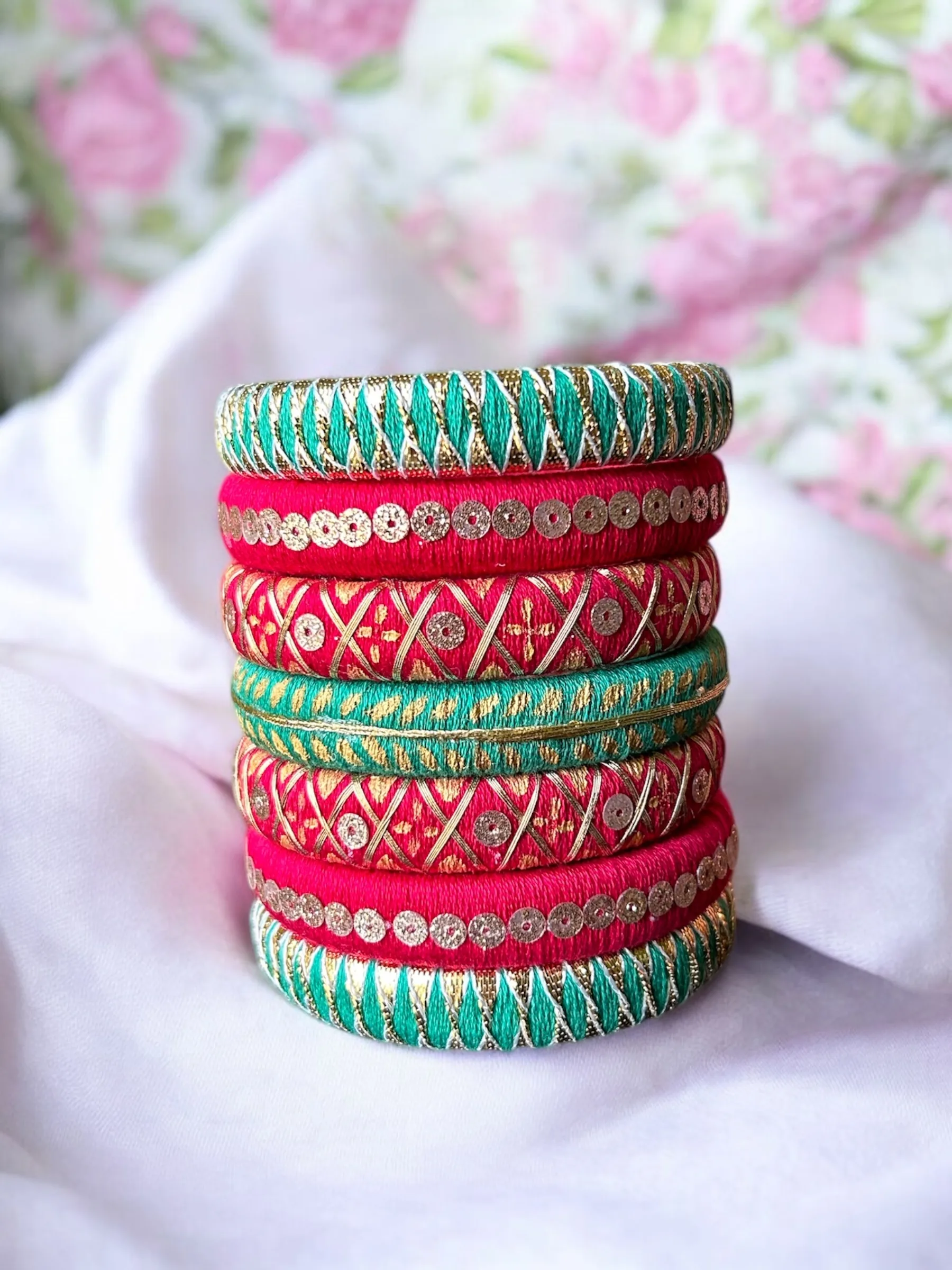 Handmade set of 7 bangles in rich rani pink and emerald green tones, wrapped in thread and adorned with intricate mirror and metallic detailing. Designed especially for newlyweds, this elegant stack brings together traditional bridal colors with a festive, luxurious finish—perfect for completing your Shaadi and post-wedding looks.
