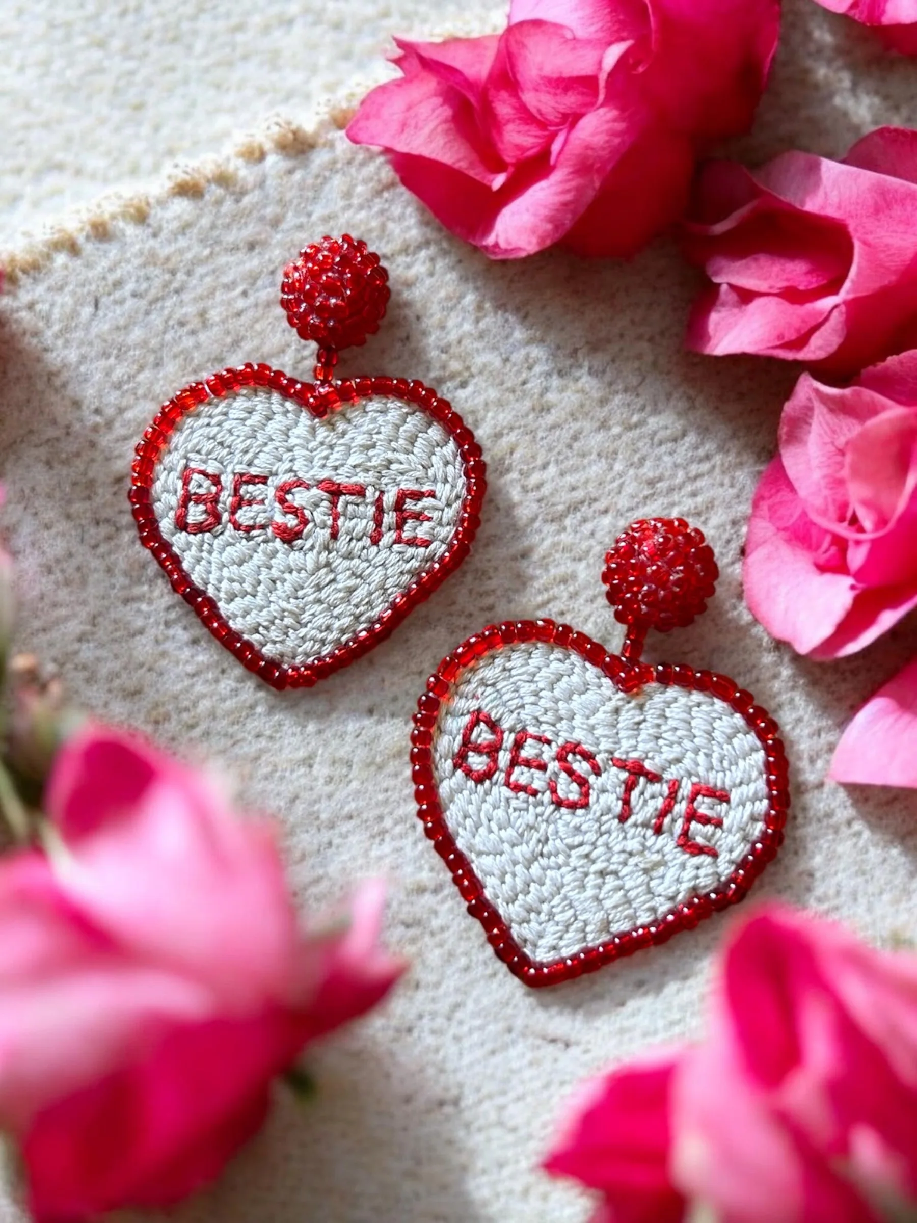 Handcrafted with delicate threadwork and bead detailing, featuring the word “BESTIE”, they’re the kind of piece that instantly adds personality to your look. Cute, quirky, and full of meaning—these are not just earrings, they’re a vibe.