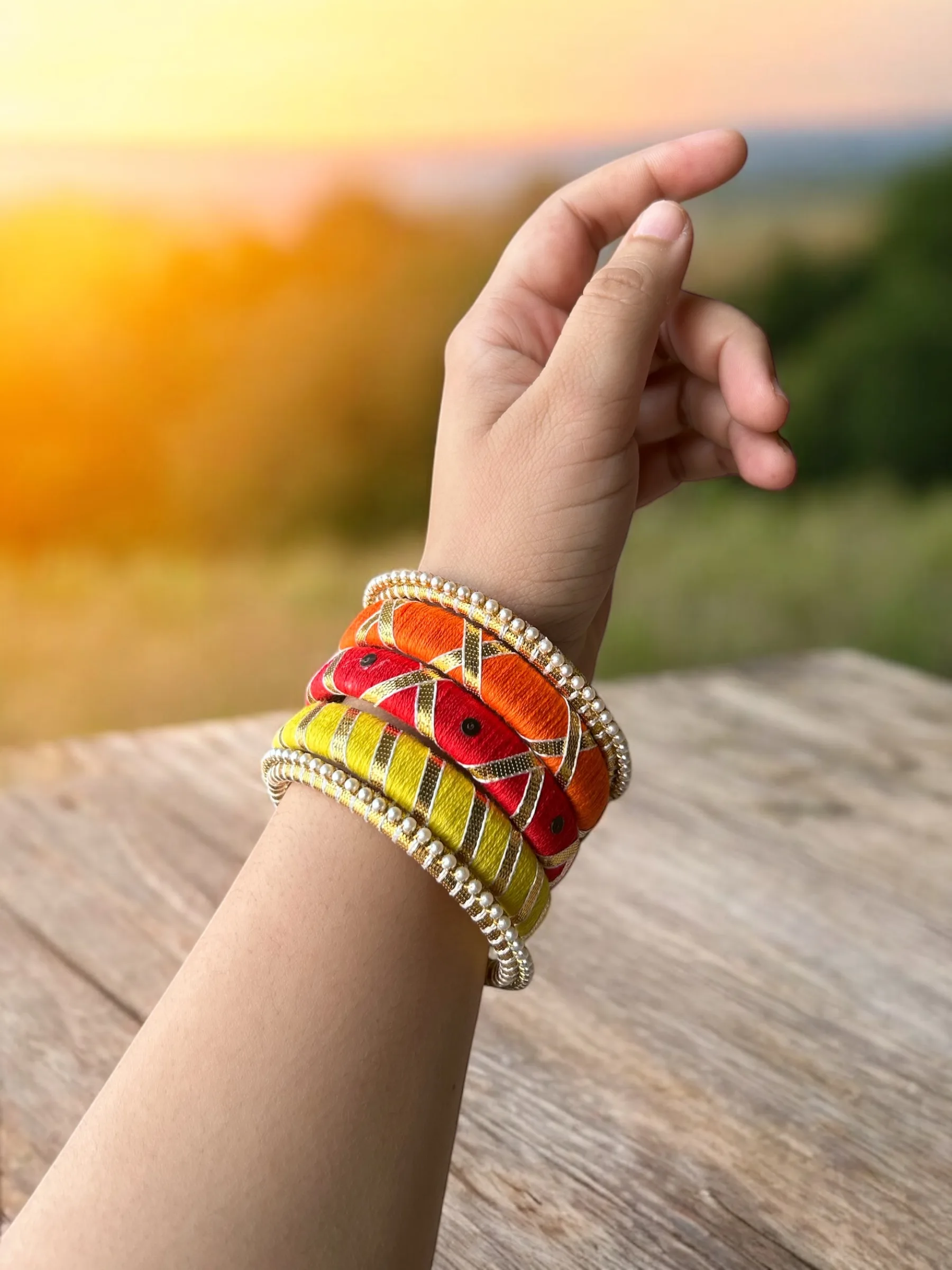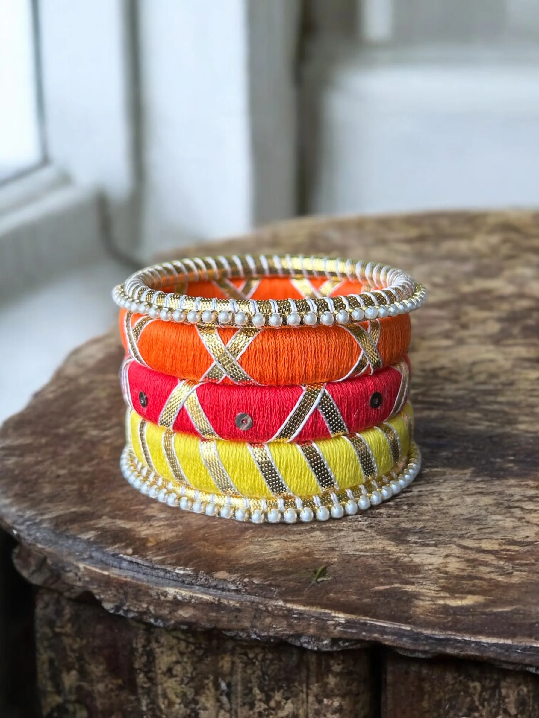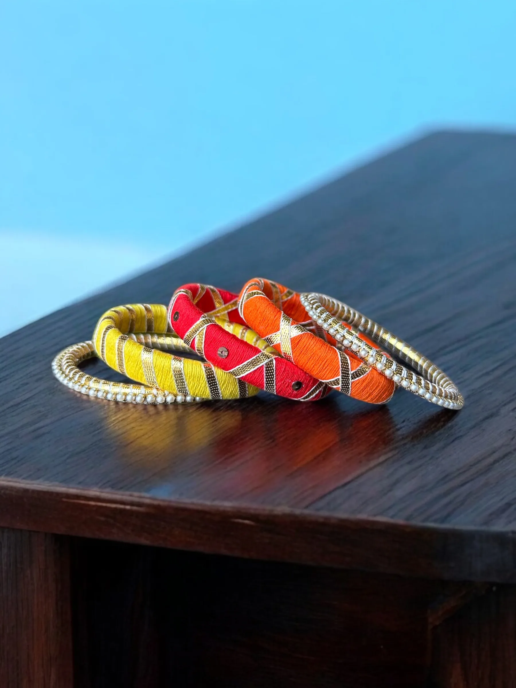 Handmade set of 5 bangles in bold shades of orange, red, and yellow, wrapped in thread and detailed with metallic accents and pearl edging. A vibrant, high-impact stack designed to bring instant energy and elevate your festive and statement looks.