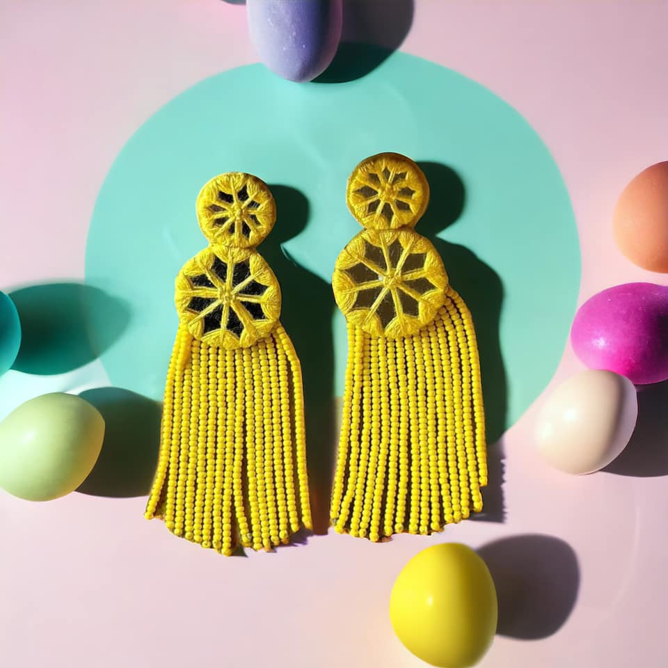 Bright, bold, and full of festive charm, these yellow latkan-style earrings are designed to make a statement. Featuring intricate mirror and beadwork detailing with flowing tassels, they add a vibrant pop of color and movement to your look—perfect for celebrations and standout styling.