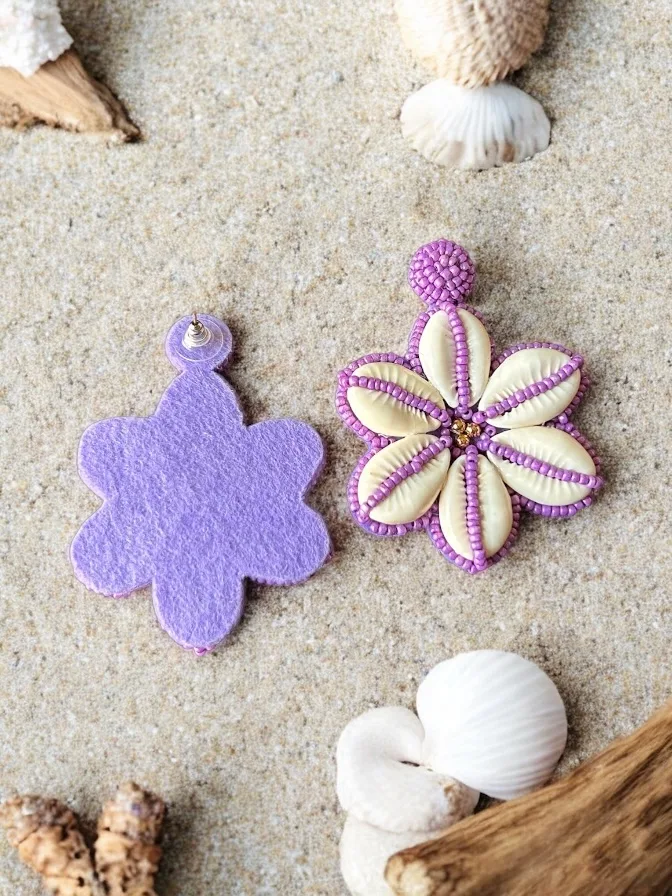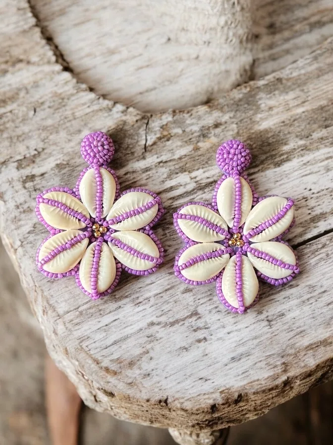 Handcrafted floral statement earrings featuring delicate cowrie shell petals, outlined with pastel bead detailing and finished with a subtle central accent. Soft yet eye-catching, these earrings blend boho charm with feminine elegance, making them perfect for effortless styling.