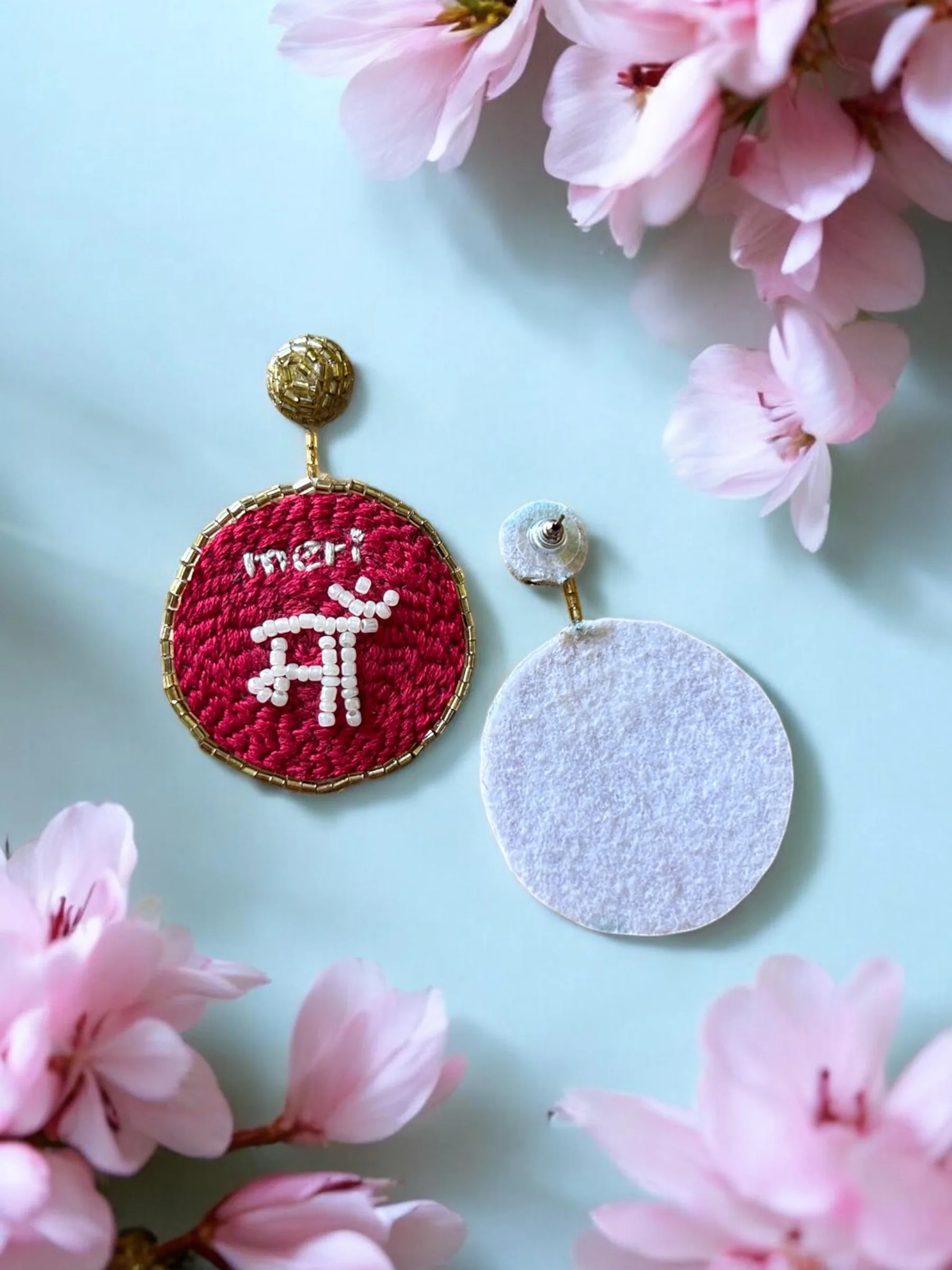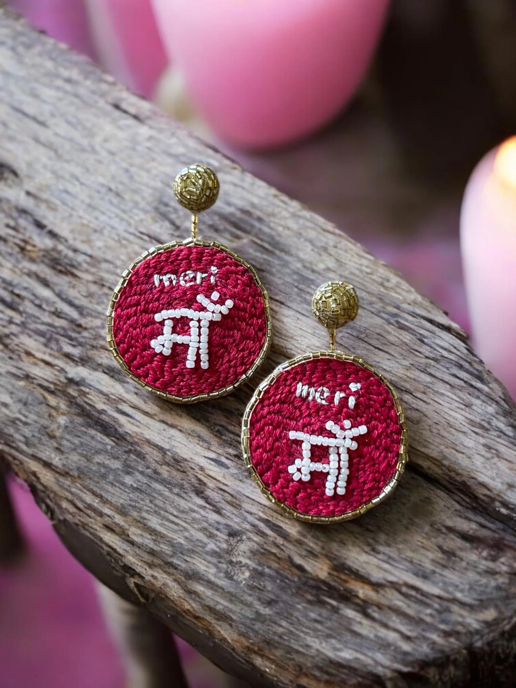 Handcrafted statement earrings featuring intricate hand embroidery with “Maa” detailing, beautifully framed with subtle beadwork. Emotional yet stylish, these earrings blend sentiment with craftsmanship, making them a meaningful addition to your festive and everyday looks.