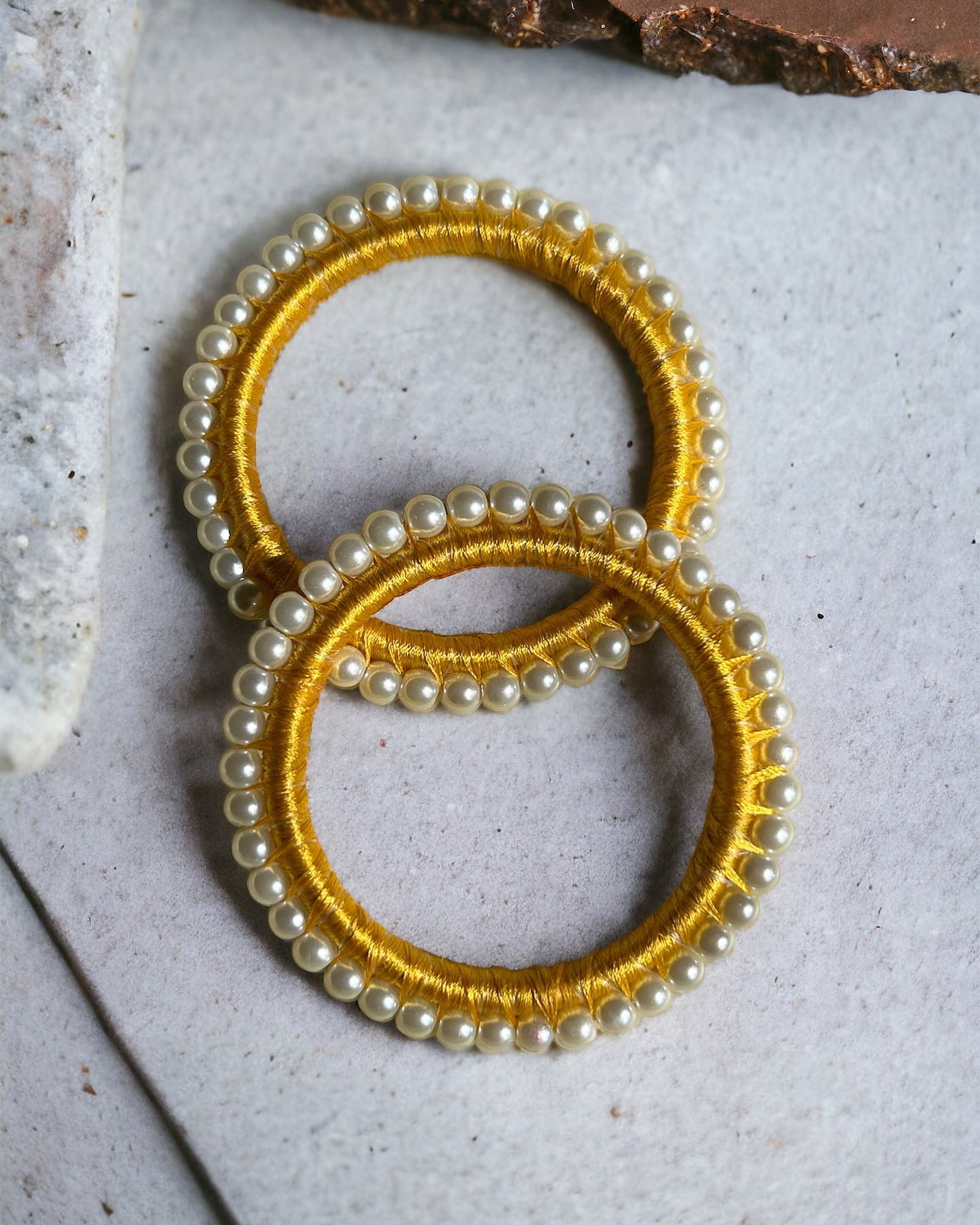 Elegant handmade bangles, wrapped in luxurious golden silk thread and adorned with delicate pearls for a timeless appeal.
