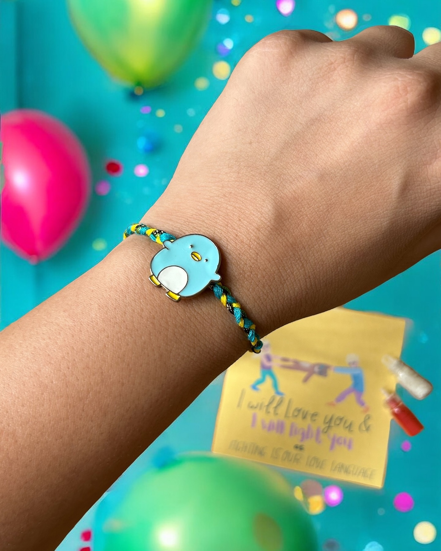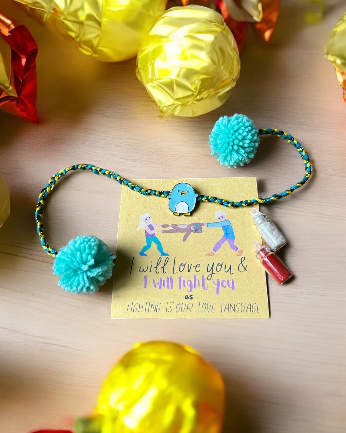 Celebrate sibling love with this adorable handmade Rakhi featuring a cheerful blue penguin charm on vibrant blue & yellow braided threads. Playful, fun, and full of personality – perfect for your brother who’s your favorite partner-in-crime. Includes a quirky greeting card that says “I will love you & I will fight you,” mini glass bottles of roli & chawal, and is packed in a premium festive box. A cute cartoon Rakhi for your brother, bro, or bhaiya that adds smiles and mischief to your Raksha Bandhan.