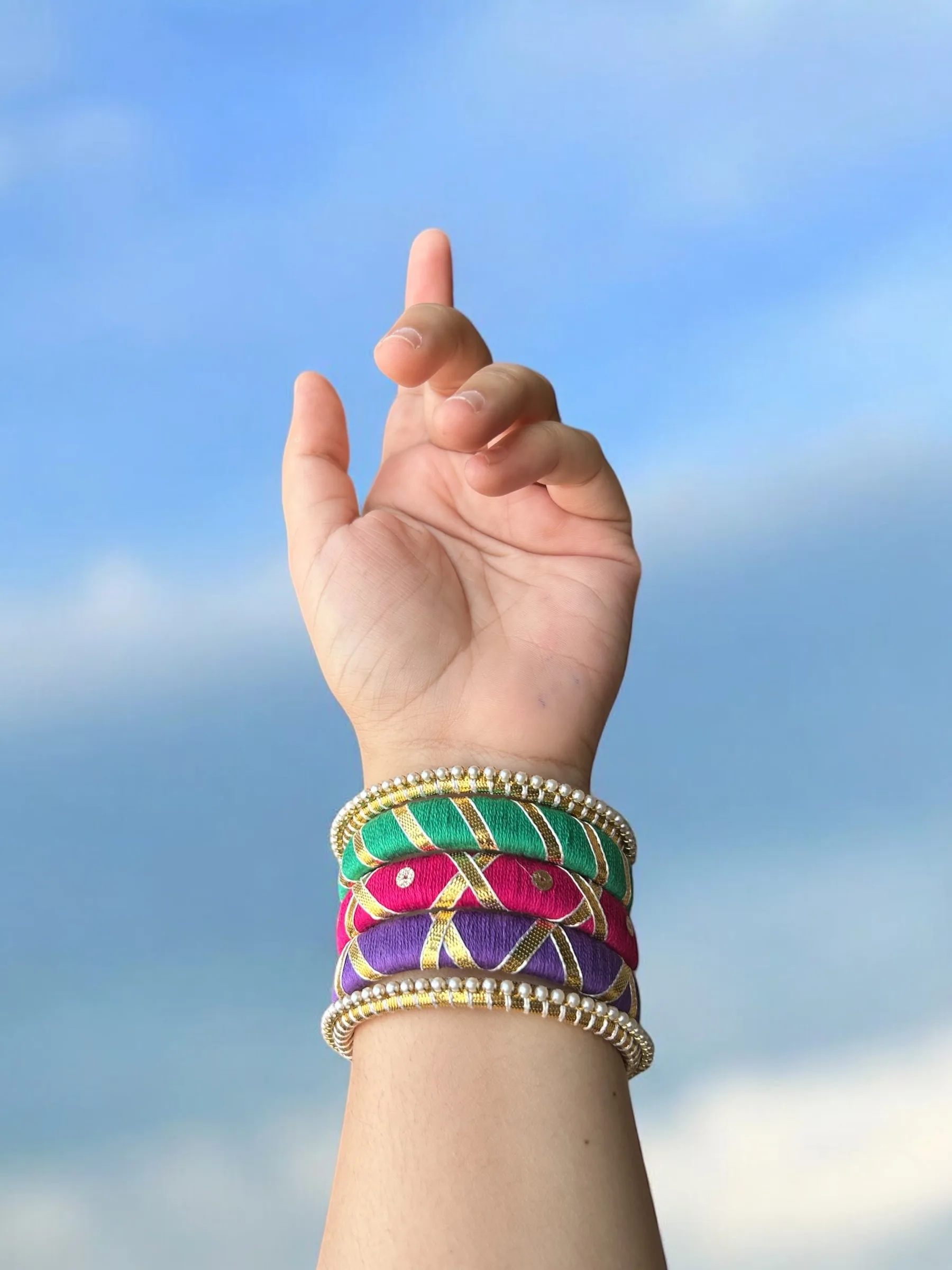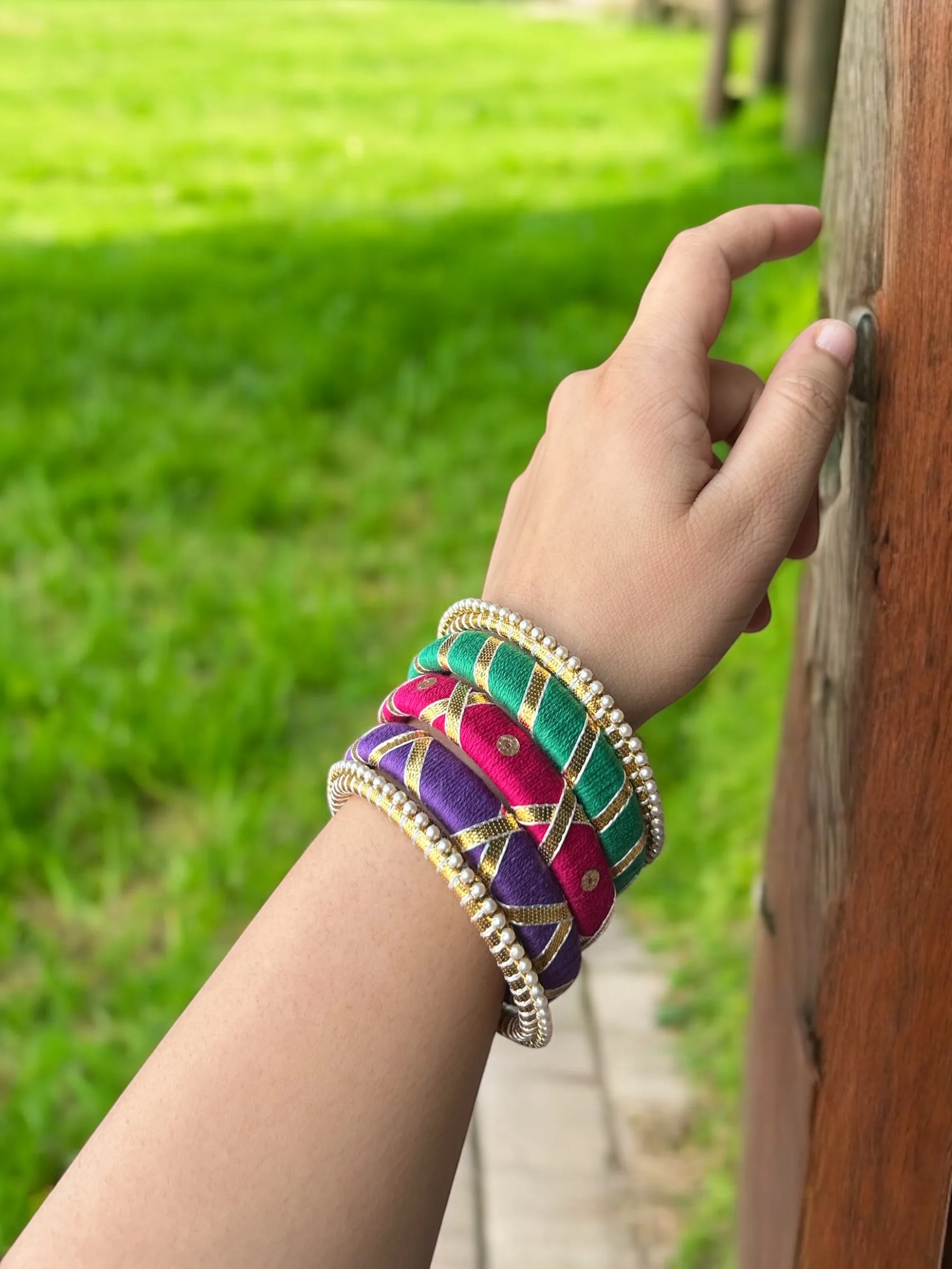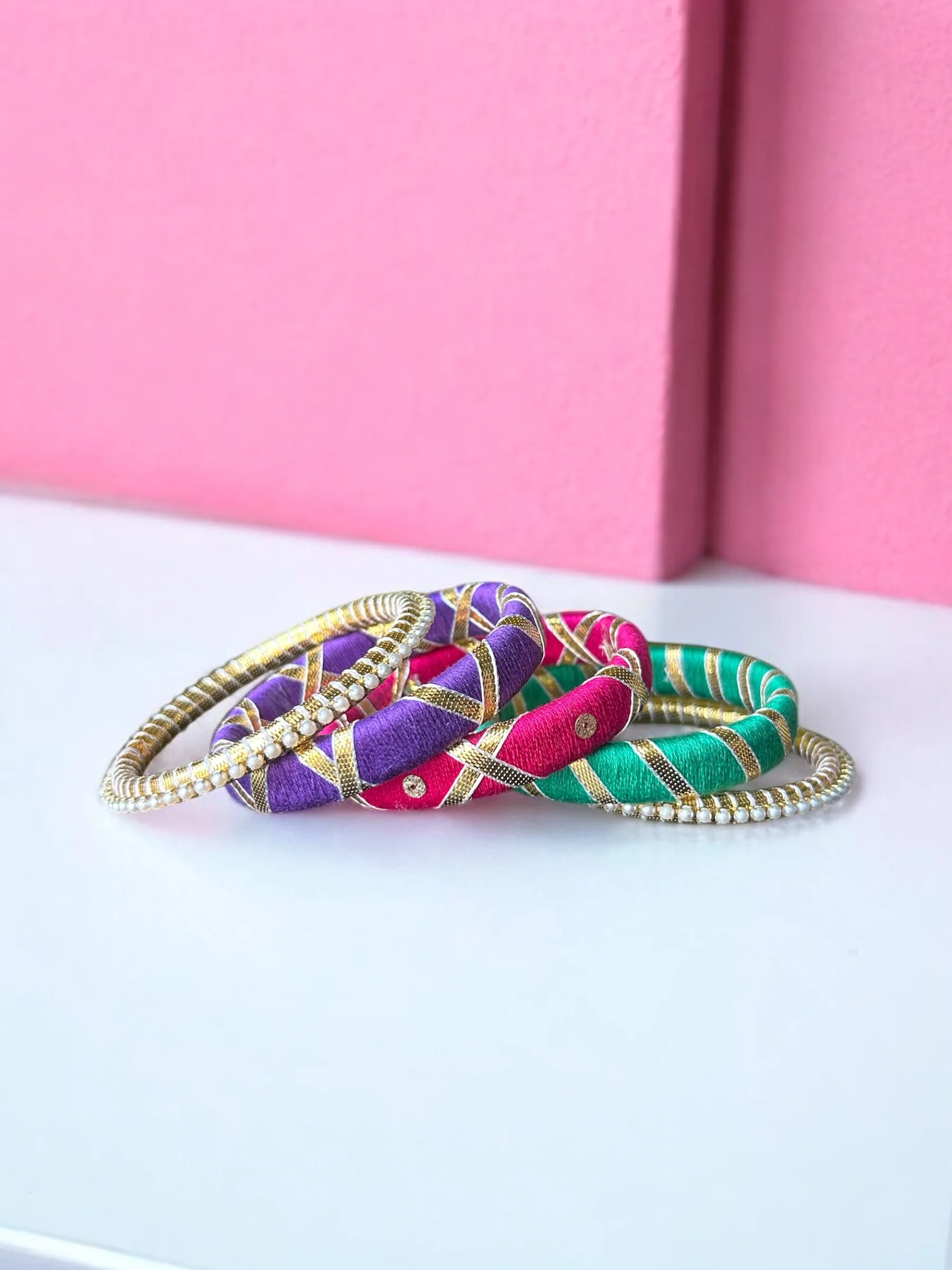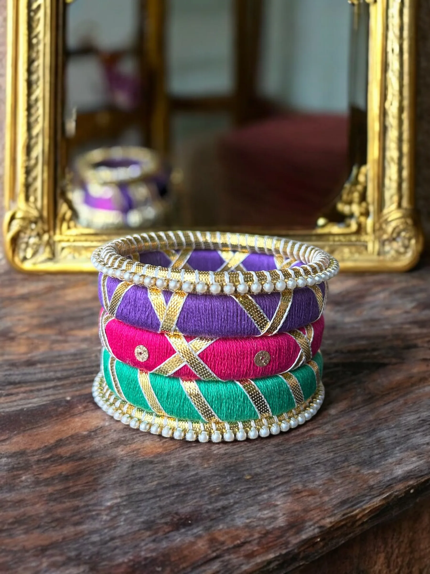 Handmade set of 5 bangles in rich jewel tones of purple, pink, and green, wrapped in thread and detailed with metallic accents and pearl edging. A luxe, statement stack designed to give a bold, elevated look with a touch of royal elegance.