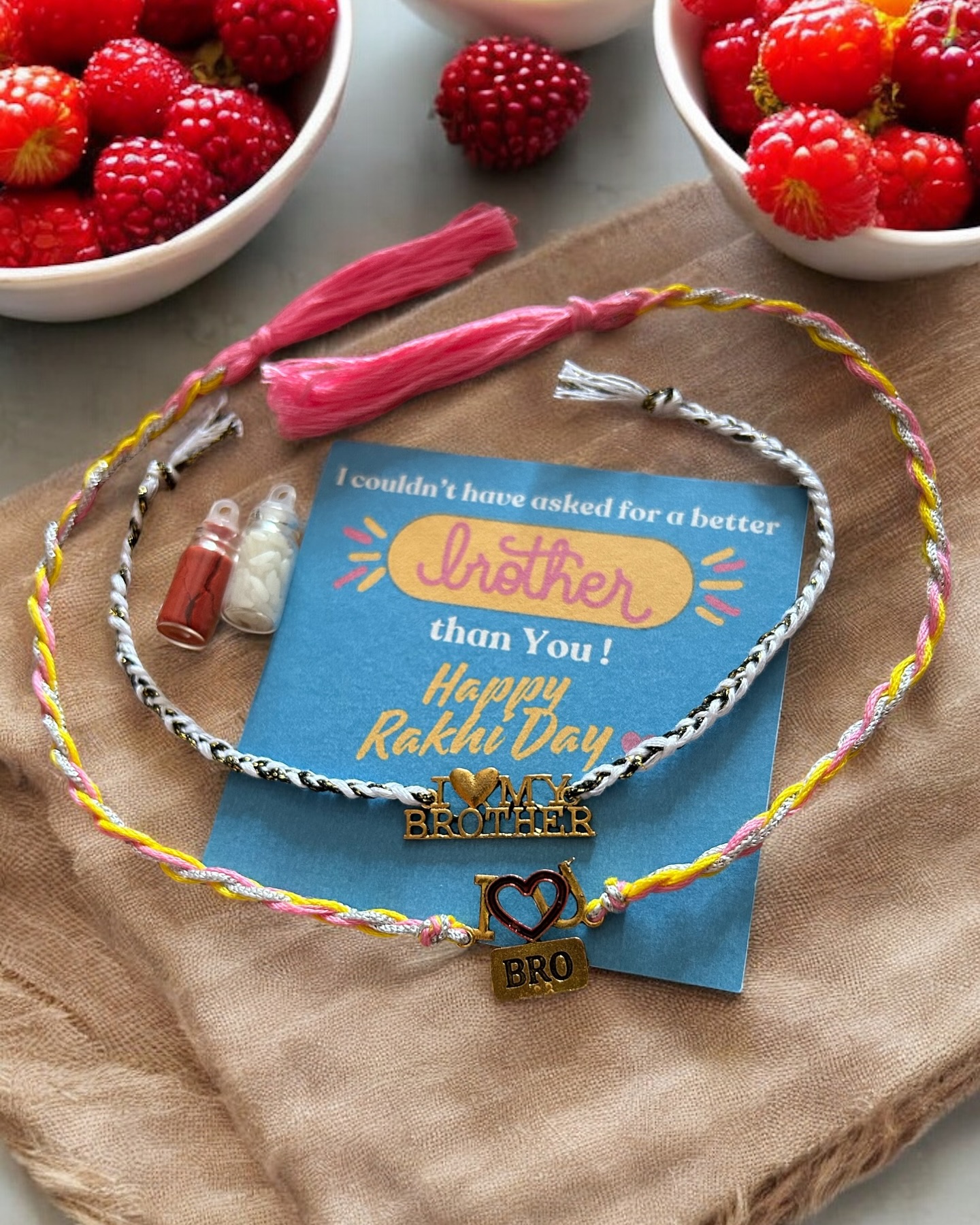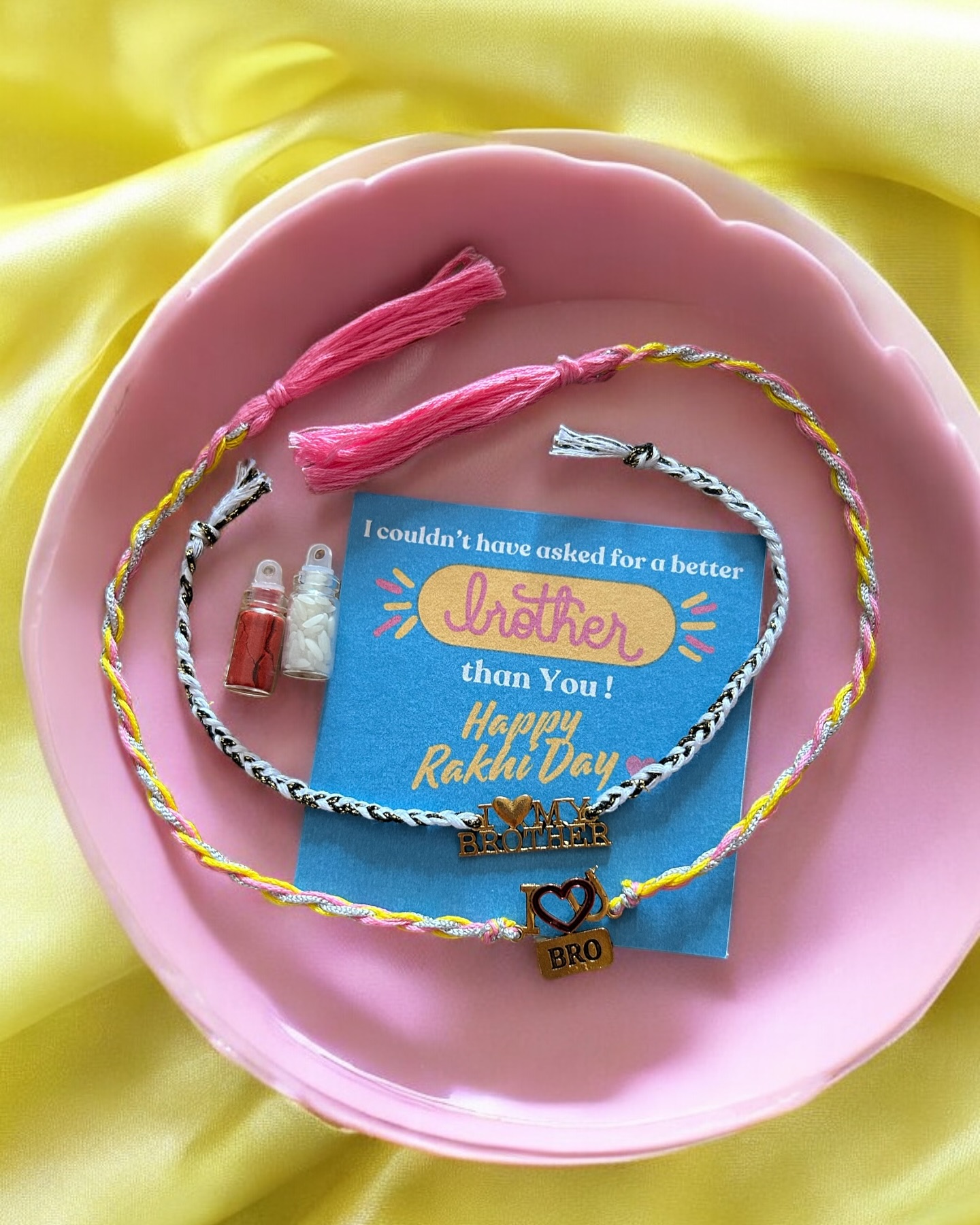 This rakhi hamper includes set of 2 brother rakhi with a small card and roli-chawal. Suitable for both kids and adults.