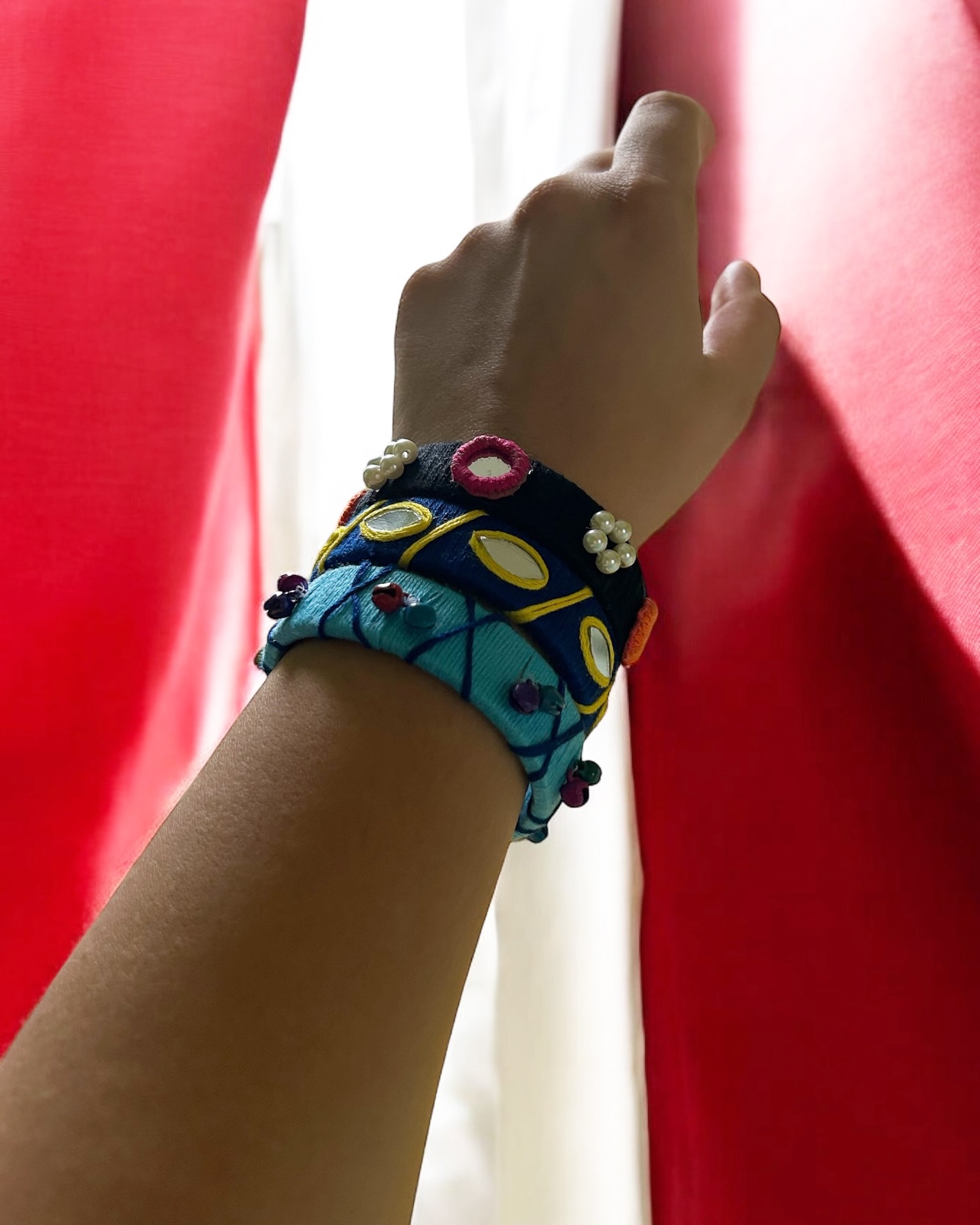 Handmade fabric bangles adorned with mirror work, pearls, and bead embellishments. Wrapped in rich, colorful fabric, they showcase intricate craftsmanship, adding a boho-chic and festive touch to any look.
