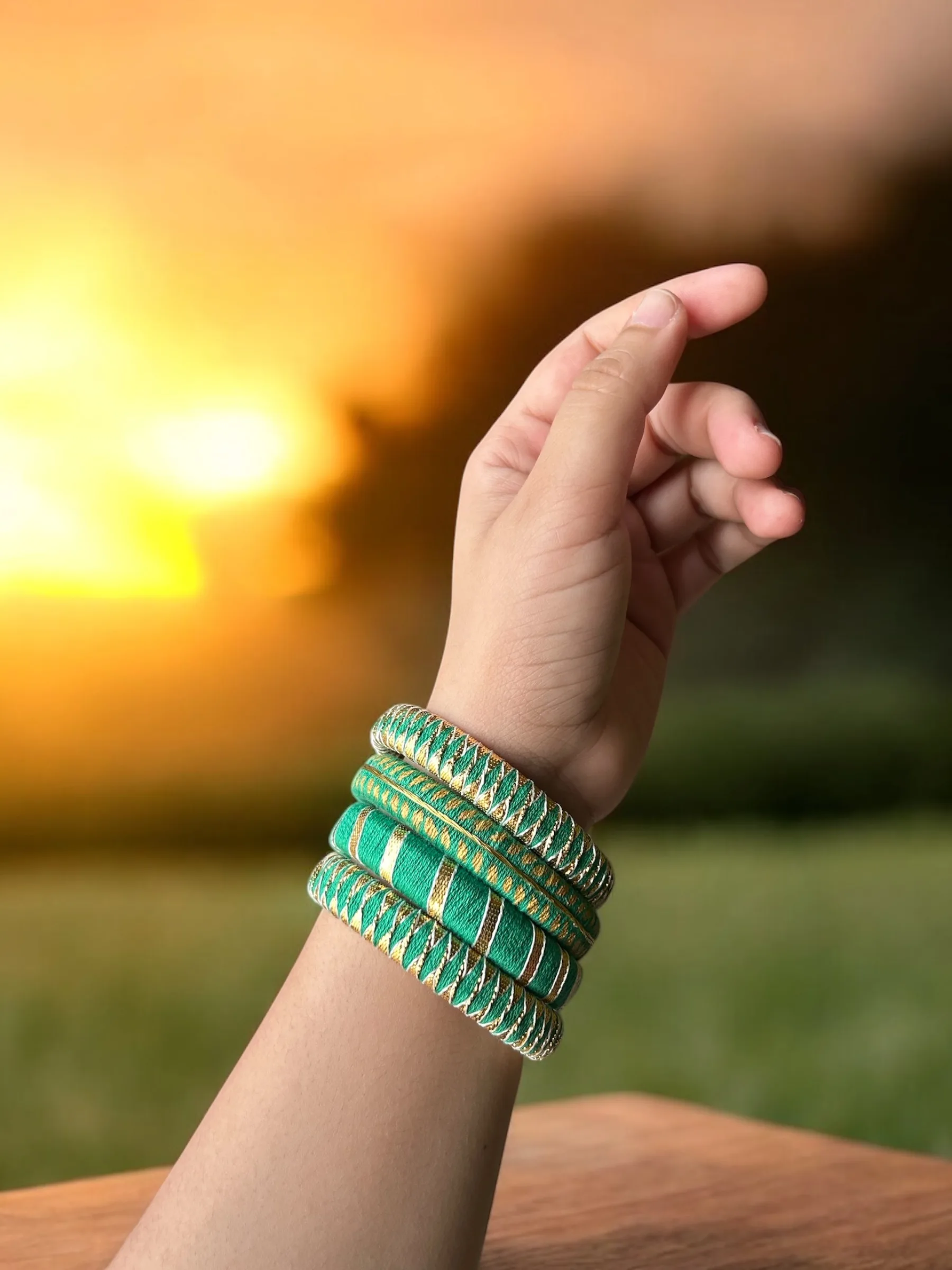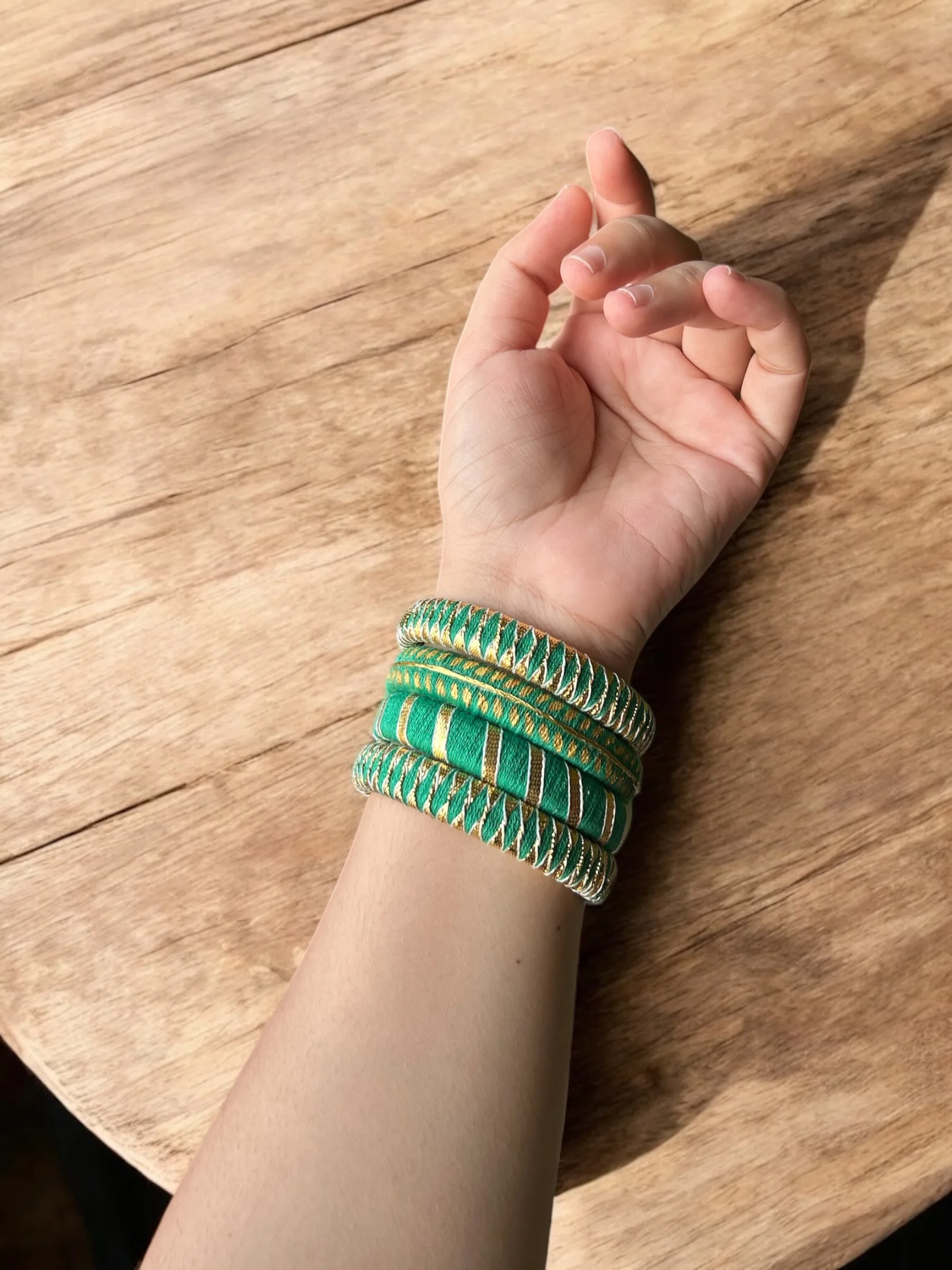Handmade set of 4 bangles in rich emerald green tones, wrapped in thread and detailed with elegant hand painted patterns and subtle metallic accents. A timeless, versatile stack that blends traditional charm with a clean, modern aesthetic—perfect for both festive and everyday wear.