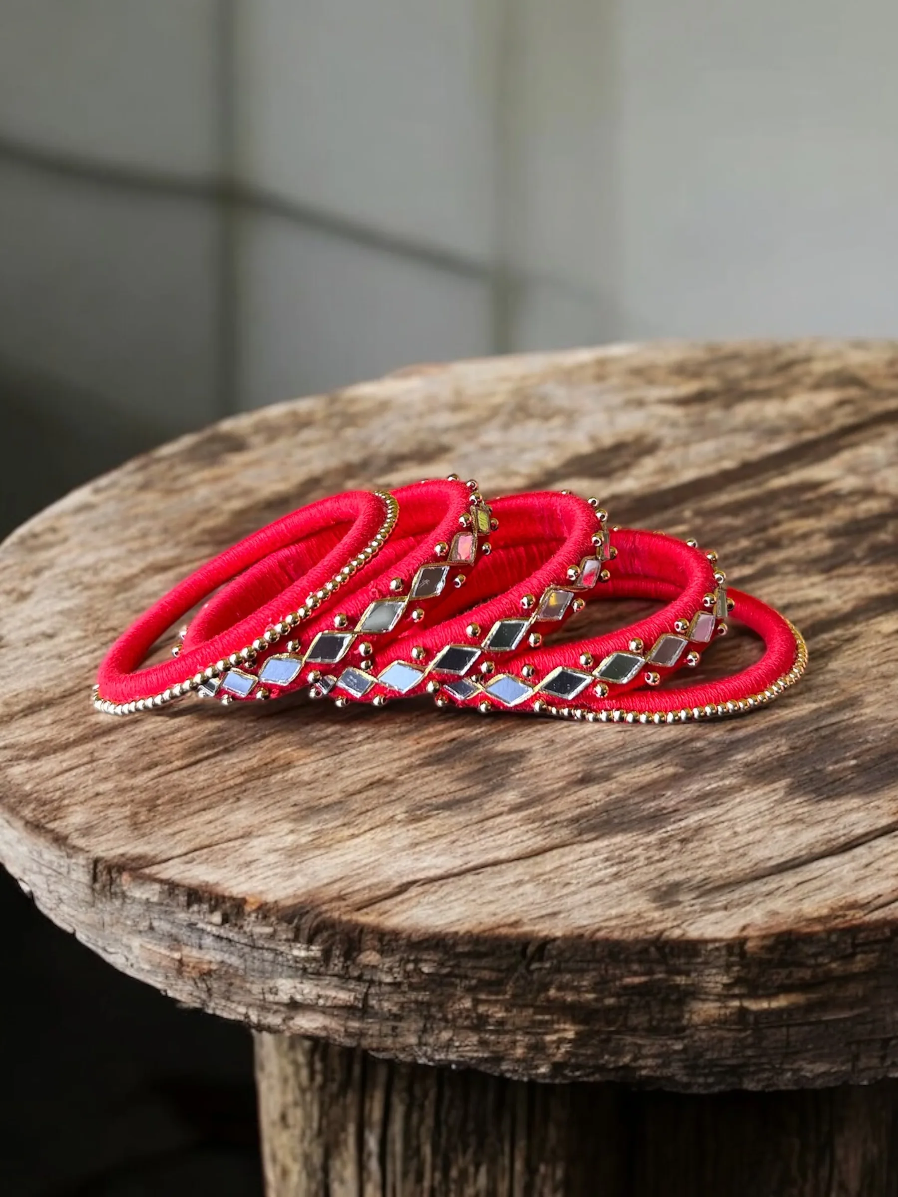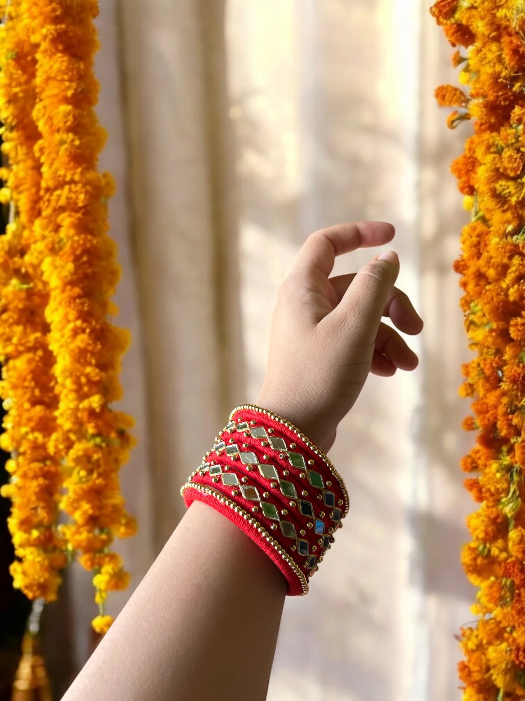 Handmade set of 5 bangles in rich rani red, wrapped in thread and adorned with delicate mirror work and metallic bead detailing. A bold, festive stack designed to add instant glamour and a striking statement to any traditional or occasion look.