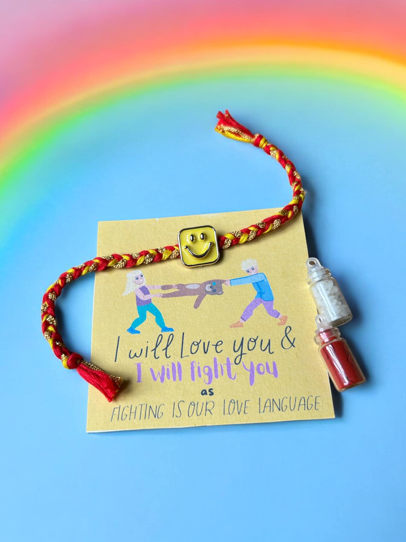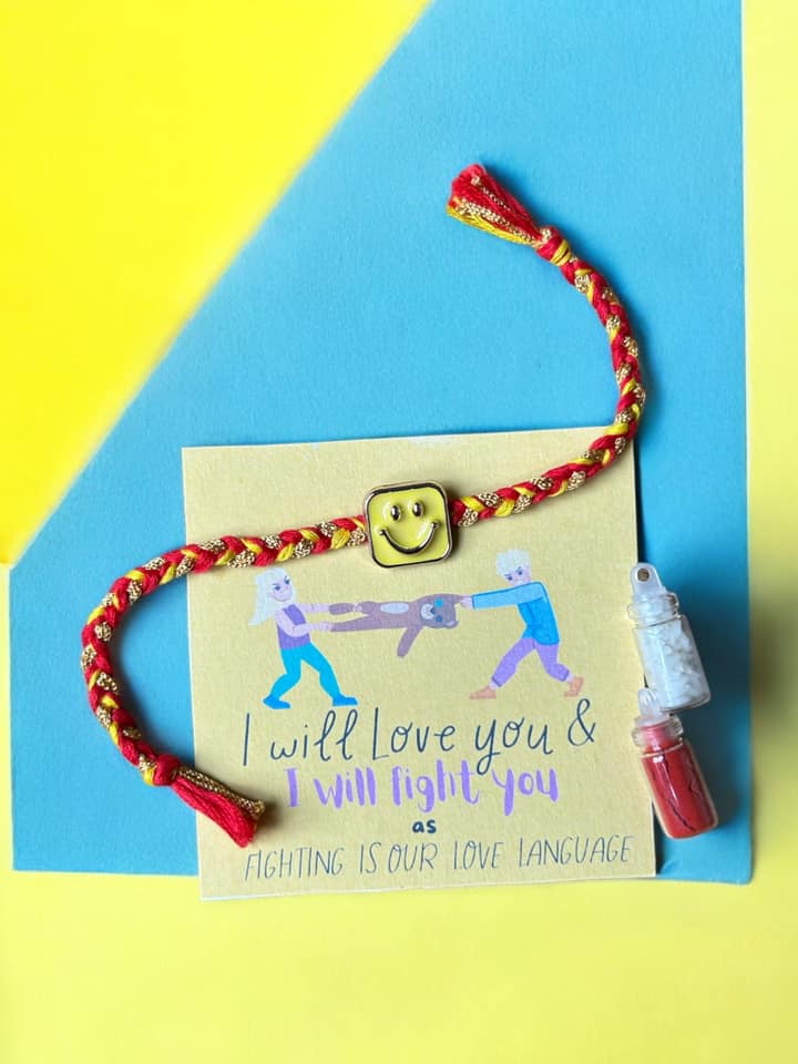 This Rakhi hamper includes Smiley kids Rakhi with a small card and roli-chawal. Suitable for both kids and adults.