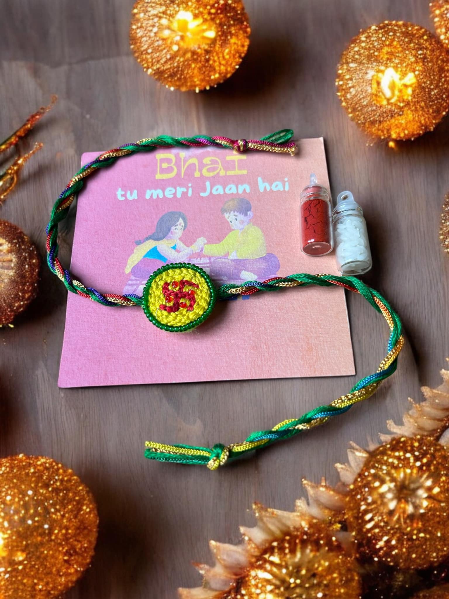 This rakhi hamper includes “Swastik” handmade beaded rakhi with a small card and roli-chawal.