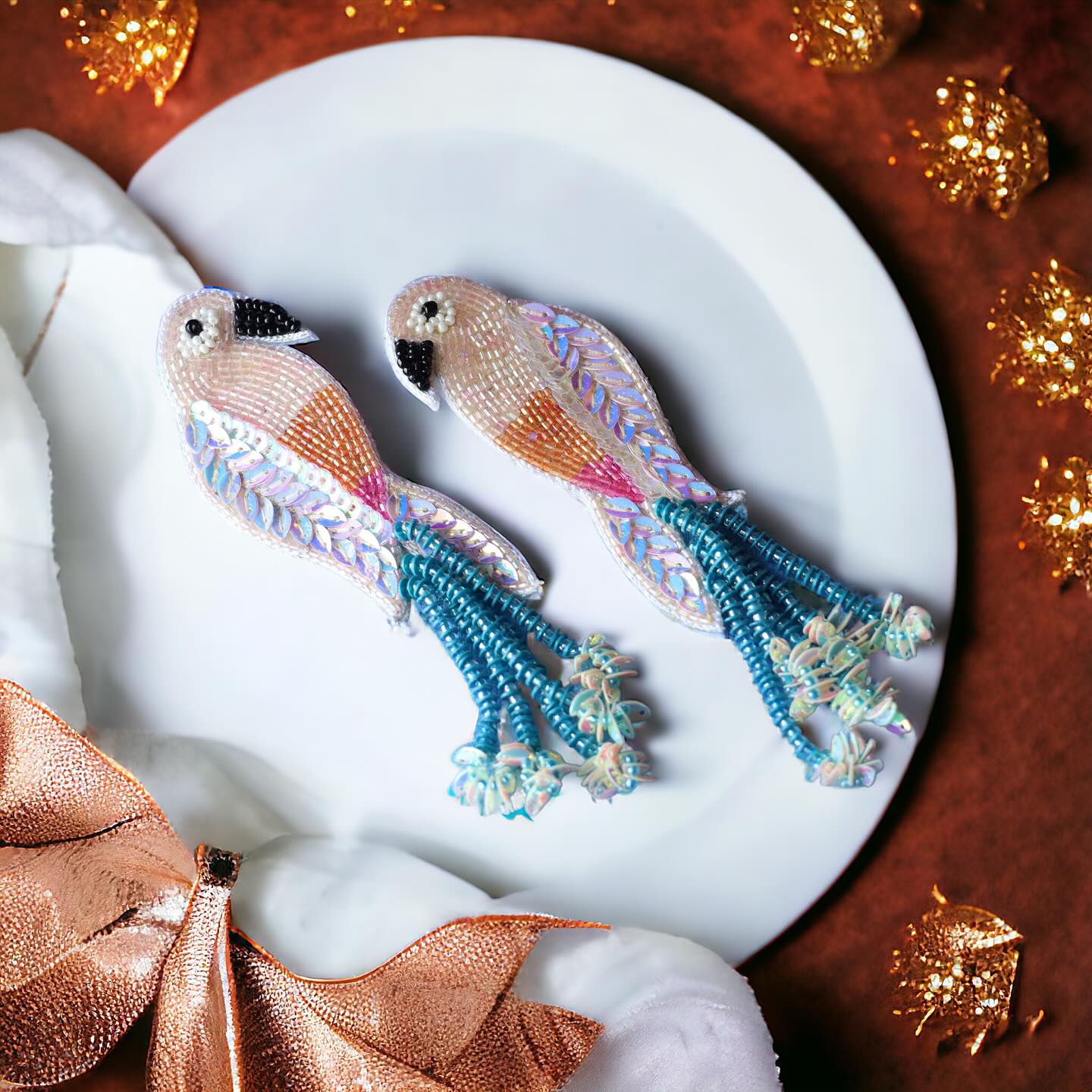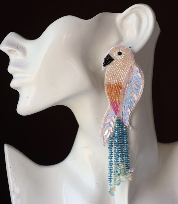 These beaded earrings feature a dazzling array of beads in vibrant hues, mirroring the kaleidoscope of colors found in real parrots. The meticulous beadwork captures the essence of these lively birds, creating a lively and eye-catching accessory.