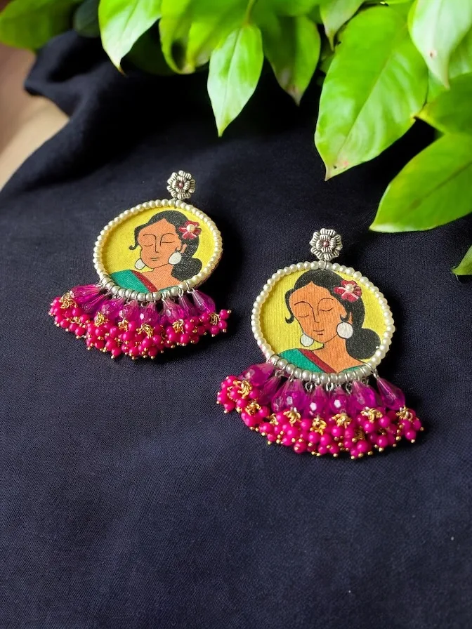 Handmade statement earrings featuring a handpainted Madhubala-inspired motif, framed with pearl detailing and finished with vibrant pink bead tassels. A bold, nostalgic piece that blends vintage Bollywood charm with a playful, modern aesthetic.