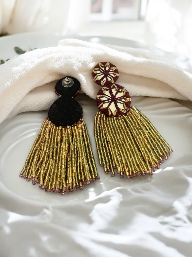Handcrafted statement earrings featuring intricate threadwork motifs, paired with flowing gold bead tassels for a bold and festive finish. Rich in texture and detail, these earrings bring together traditional craftsmanship with a striking statement look, perfect for elevating your wedding and party outfits.