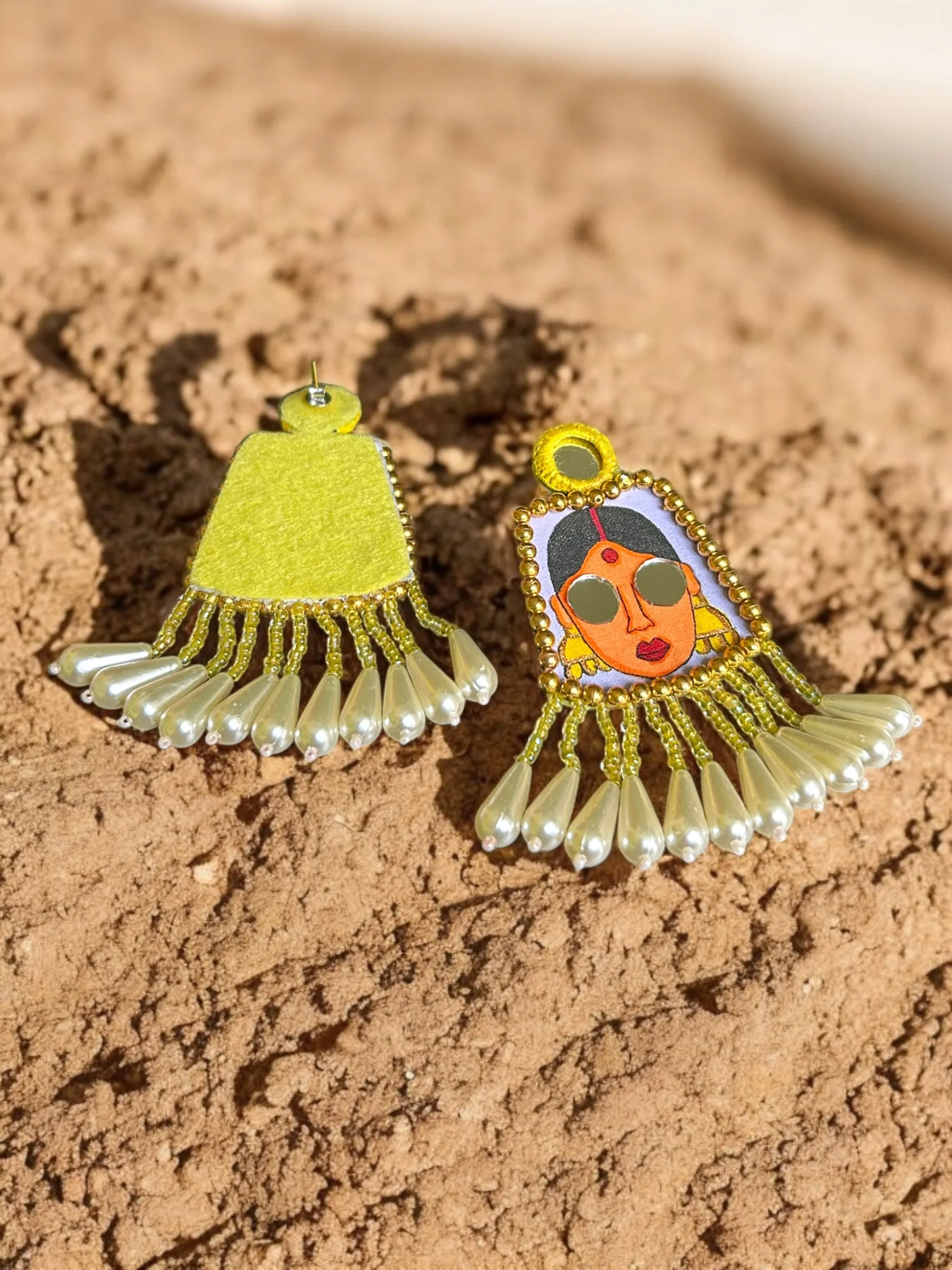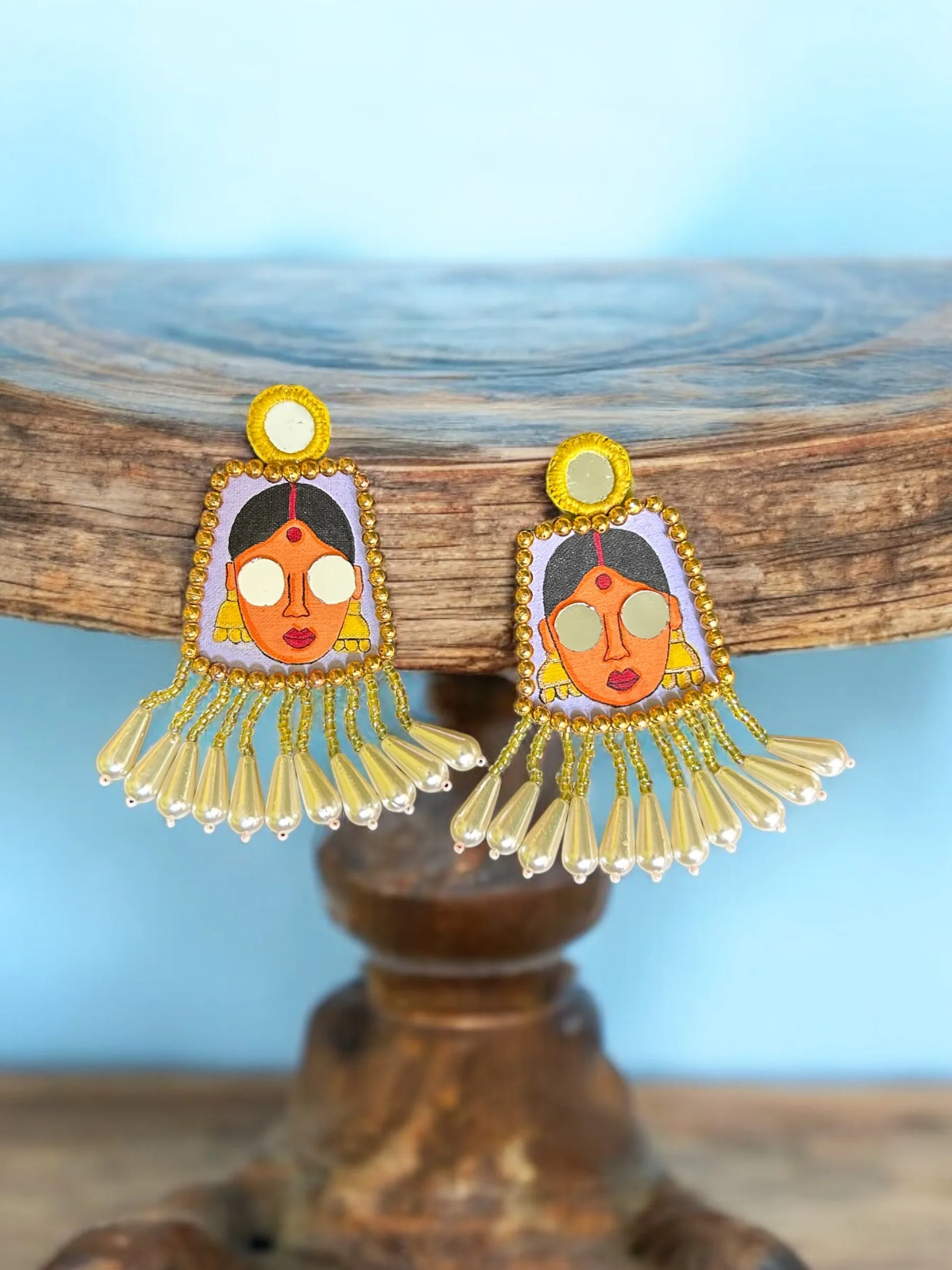 Handmade statement earrings featuring a handpainted woman motif, highlighted with golden detailing and finished with pearl drop tassels. A bold, expressive piece that celebrates desi femininity with a modern, statement aesthetic.