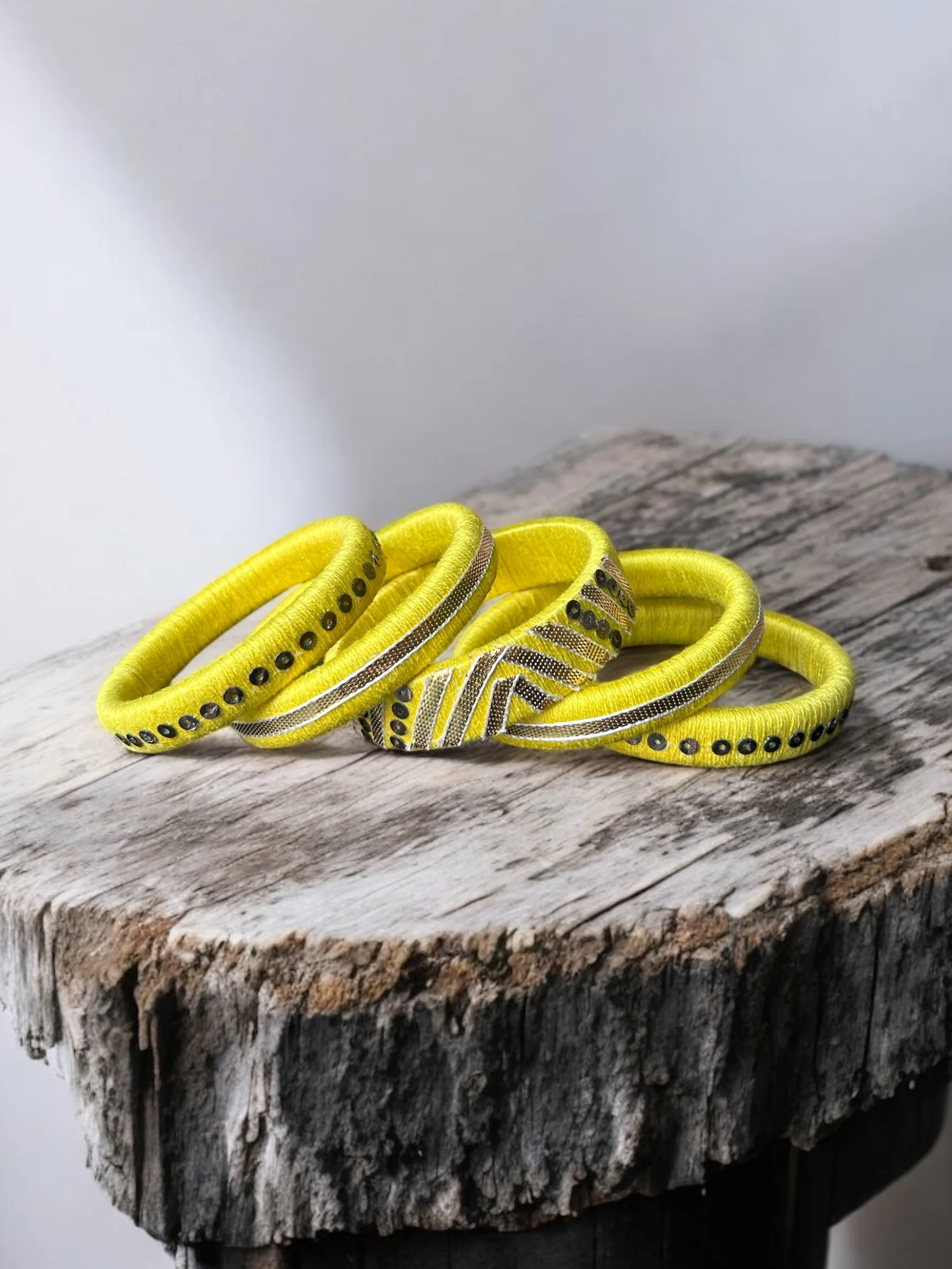 Handmade set of 5 bangles in a soft yet striking butter yellow, wrapped in thread and finished with metallic detailing. A fresh, statement stack designed to bring a bright, effortless glow to your everyday and occasion looks.